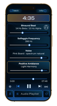 A sophisticated synthesis of modulated binaural beats, ancient resonant Solfeggio frequencies, immersive nature recordings and adaptive ambient soundscapes. Dynamically composed to guide you toward your goal – supporting cognitive function, emotional tranquility and physiological balance.